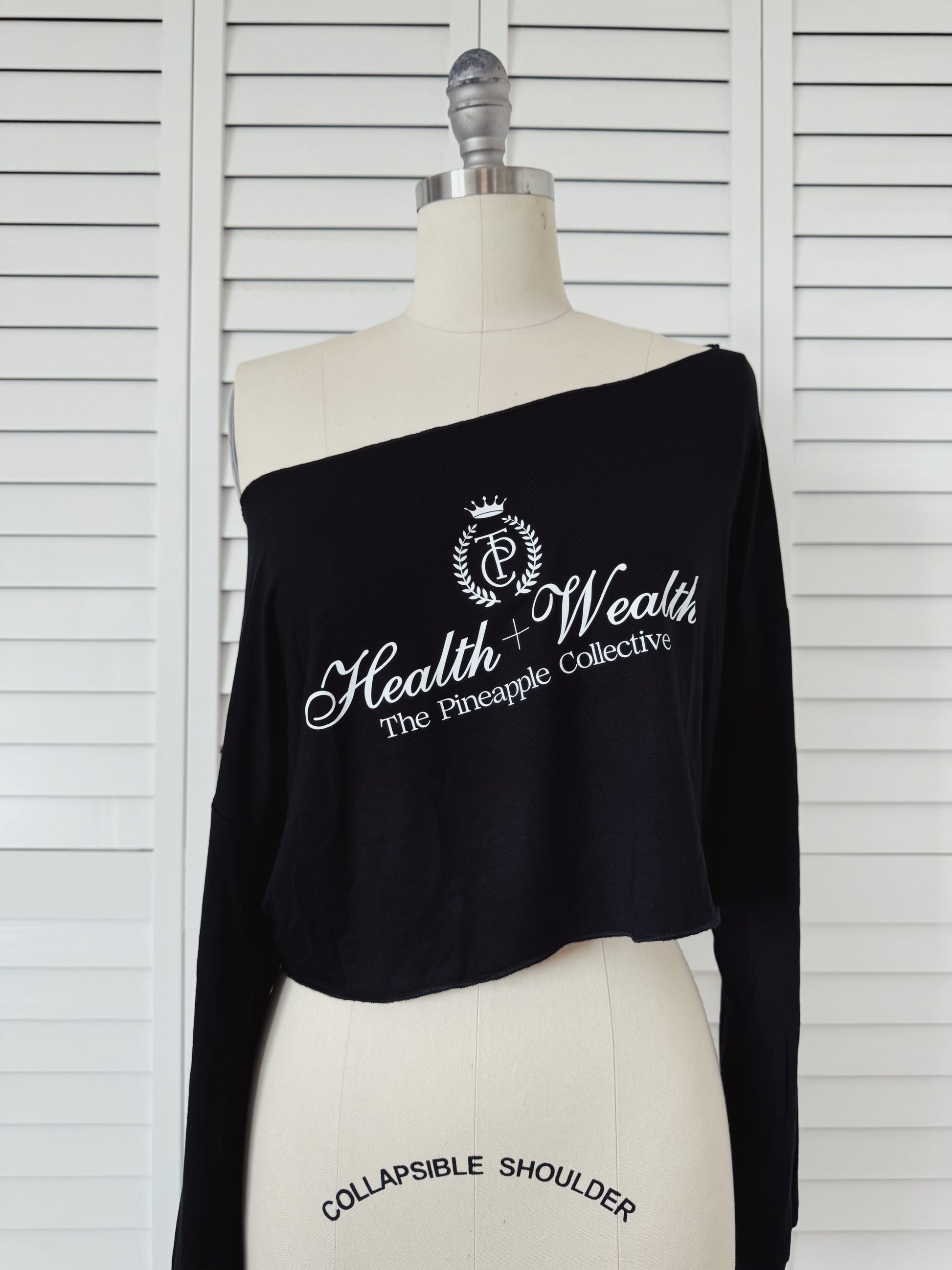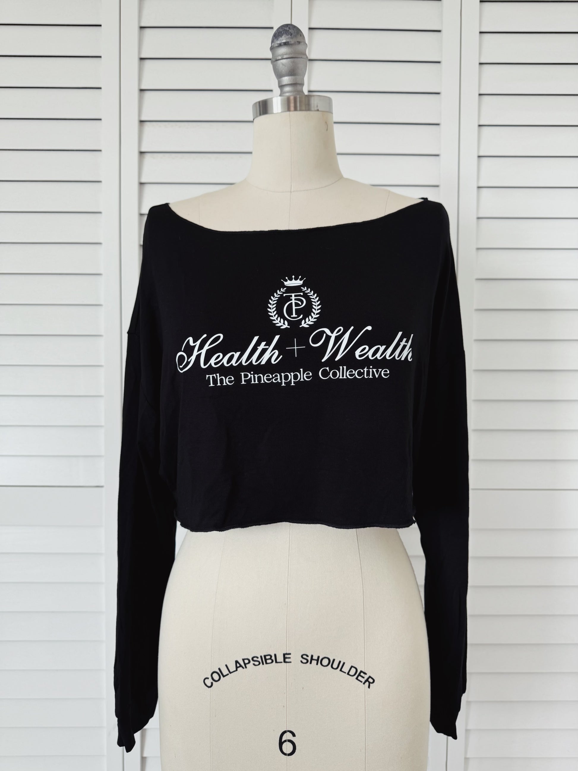 - Black cropped dropped shoulder long sleeve tee with white Health + Wealth Logo